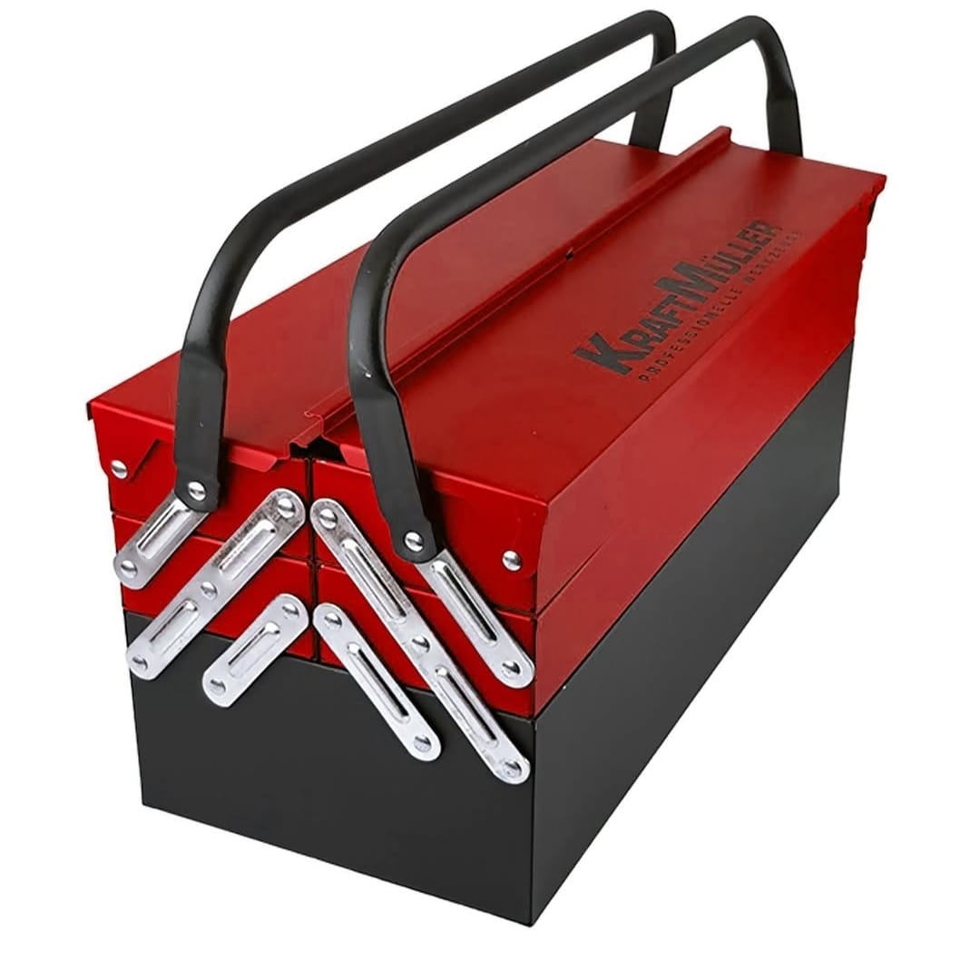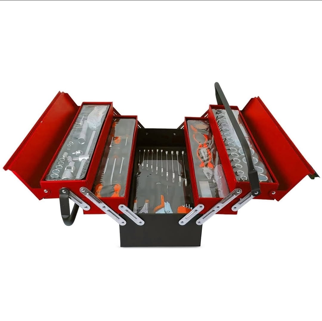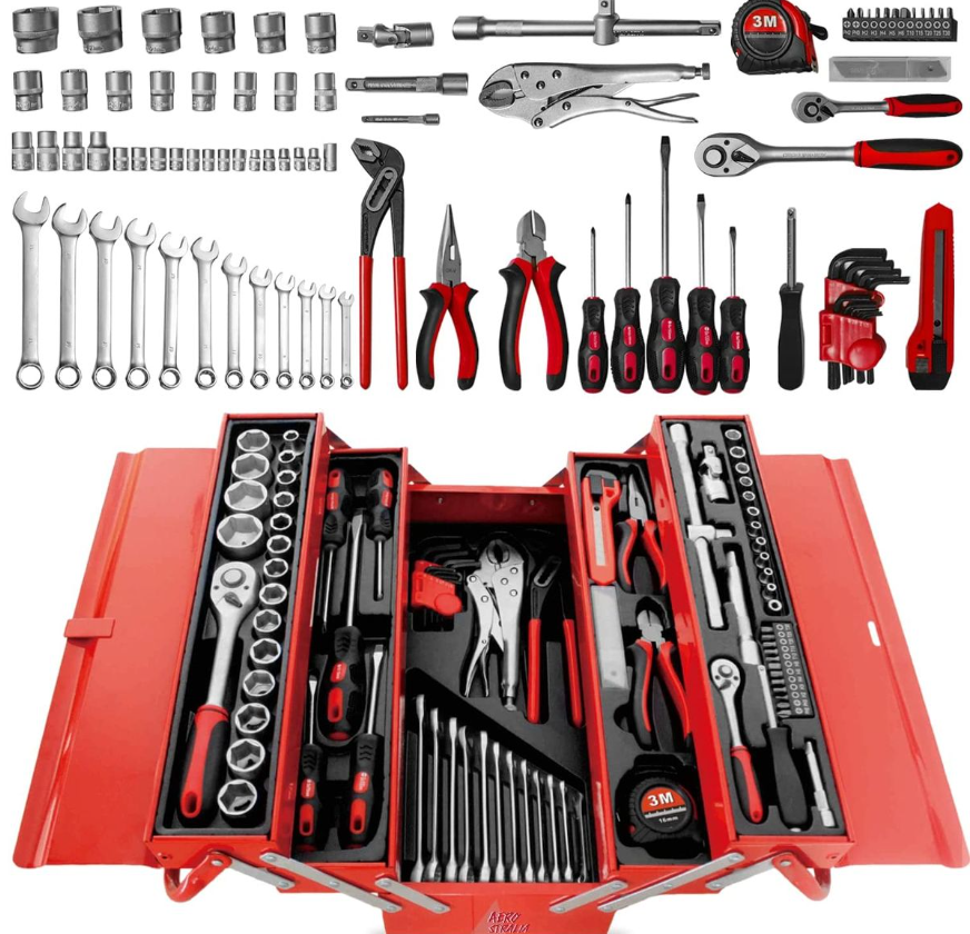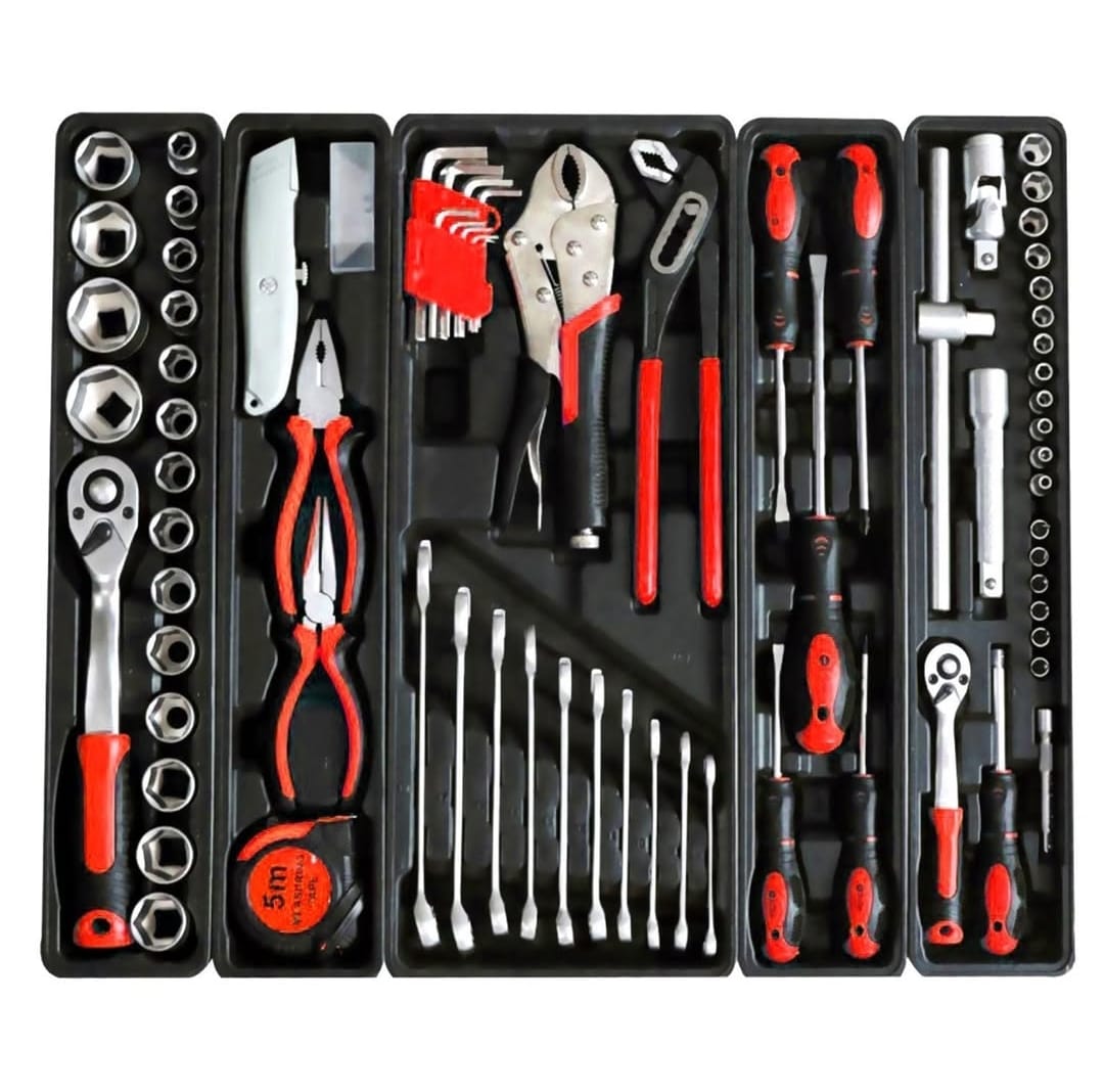 – 5 chave de fendas. 5 x 75, 6 x 100, 8 x 150 mm, PH1 x 75 mm, PH2 x 100 mm, 1 x 10″ grampo multi-tira -1 x 10″ grampo de vĂcio 9 x Chaves Allen 1,5-10 mm, 12 x chaves planas – 6, 8, 9, 10, 111, 12, 13, 15, 15, 16, 17, 19 mm – 1 caixa de metal.